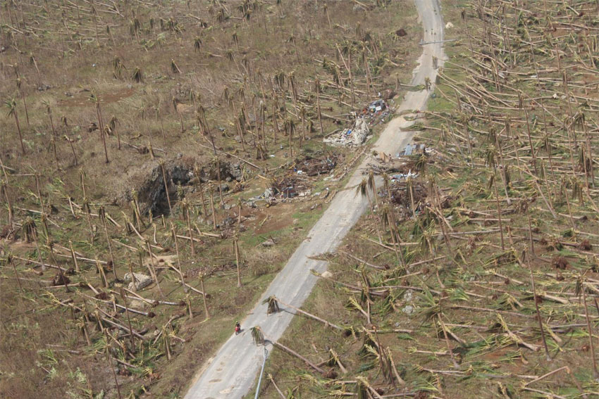 (11 November 2013, Eastern Samar, Philippines: Coconut trees knocked down by the storm, devastating the livelihood of the people in Eastern Samar. Credit: IOM/Conrad Navidad)