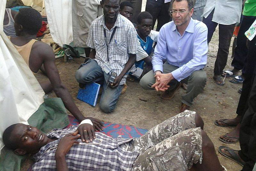 (DSRSG Toby Lanzer speaking to an injured man seeking shelter at the UNMISS protection site. Photo: UNMISS/Tina Turyagyenda)