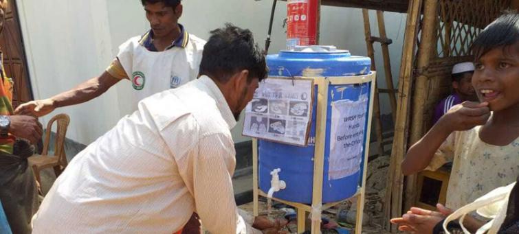Photo caption and credit: UNHCR Rohingya refugees use a handwashing station, installed to help combat the spread of COVID-19 at a settlement in Cox's Bazar, Bangladesh.