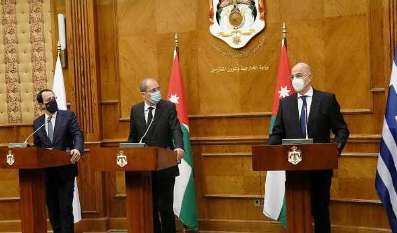 After a trilateral meeting between himself, Cypriot Foreign Minister Nikos Christodoulidis and their Jordanian counterpart, Ayman Safadi, in Amman, he praised cooperation between the three countries and said they all share the same values — "peace, stability and International Law."