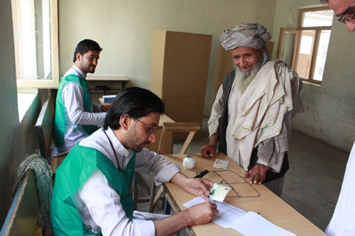 Electoral workers in Afghanistan (left) assisting a voter in the 14 June 2014 second round run-off in the country's presidential elections. Photo: UNAMA/Shamsudding Hamedi