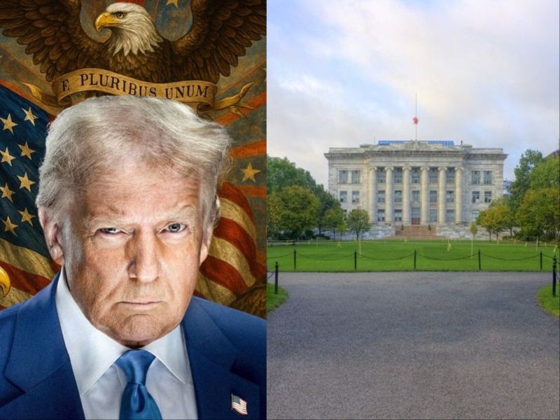Trump (L) said Harvard (R) needs 'to behave themselves' and cap admission of non-US students. Photo: X/The White House/Wikimedia Commons