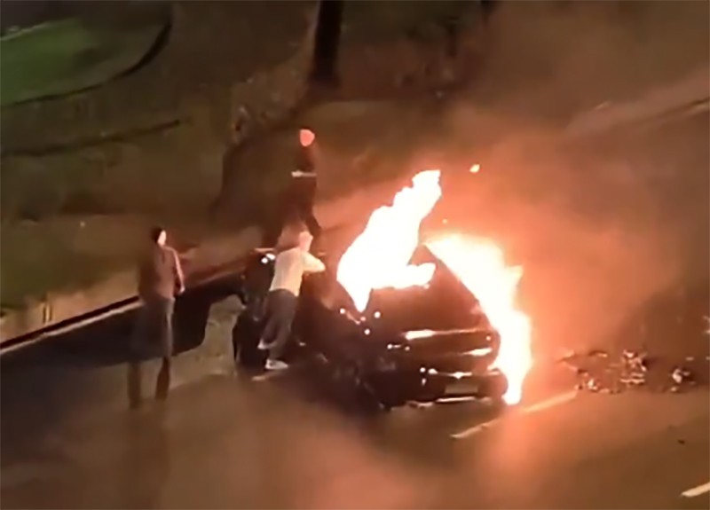 Bystanders were unable to open the vehicle’s electronic doors to rescue the driver as the car burst into flames.