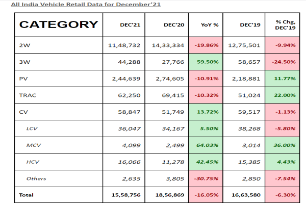 New Delhi/IBNS: Total retail sales of vehicles in the month of December 2021 stood at 15,58,756 down by 16 percent year-on-year while overall retails continue to fall by 6 percent when compared to December 2019 (a regular pre-covid month), according to the data shared by the Federation of Automobile Dealers Association (FADA).