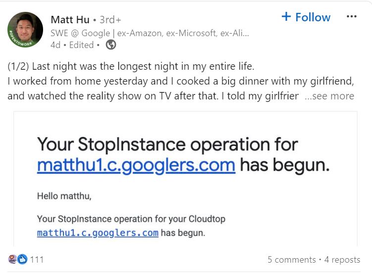 "I went downstairs and opened up my laptop. That was 21:00. I got a weird email saying 'You Cloudtop StopInstance operation has begun' and I suddenly recalled I just had the cloudtop maintenance a few days back, it couldn't be a scheduled task, there is definitely something bad happening. I even 'Momaed' (Google's internal search engine) 'what stopinstance means' and I did get the results from the website, so I chose not to believe I was leaving the company," he said, describing the time as "the longest five minutes in my life,"