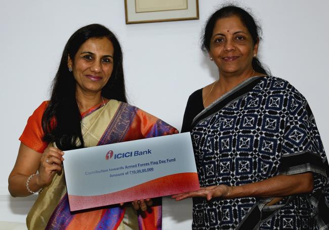The contribution, payable in two equal tranches this year and next year, will be utilised towards welfare activities and betterment of the families of ex-servicemen who have lost their lives guarding the nation. Chanda Kochhar, MD & CEO, ICICI Bank on Monday handed over a cheque worth Rs. 5 crore to the Honourable Minister of Defence Nirmala Sitharaman at a function in the Raksha Mantralaya.