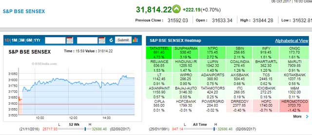 Mumbai, Oct 6 (IBNS): The Indian market closed higher on Friday with Sensex up 222.19 points at 31,814.22 while NSE Nifty was up 91 points at 9979.70.