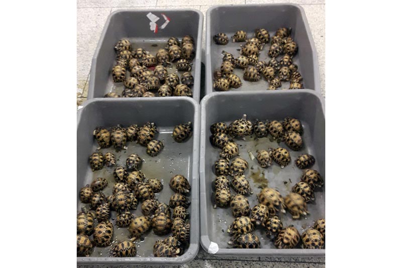 While trafficking through air, live animals are packed into handbags or suitcases depending on their size, with additional methods used to hide their presence. For instance, star tortoises are just under 12-15 cm long at the hatchling stage and grow to no more than 20-25 cm, making it easy to hide inside suitcases.