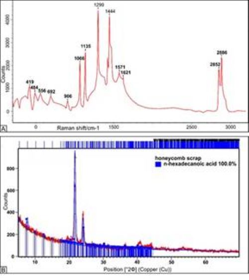 Further, Laser Raman Spectroscopy and X-Ray Diffraction (XRD) confirmed the presence of honey and wax in the material, due to the activity of bees in forming hives.