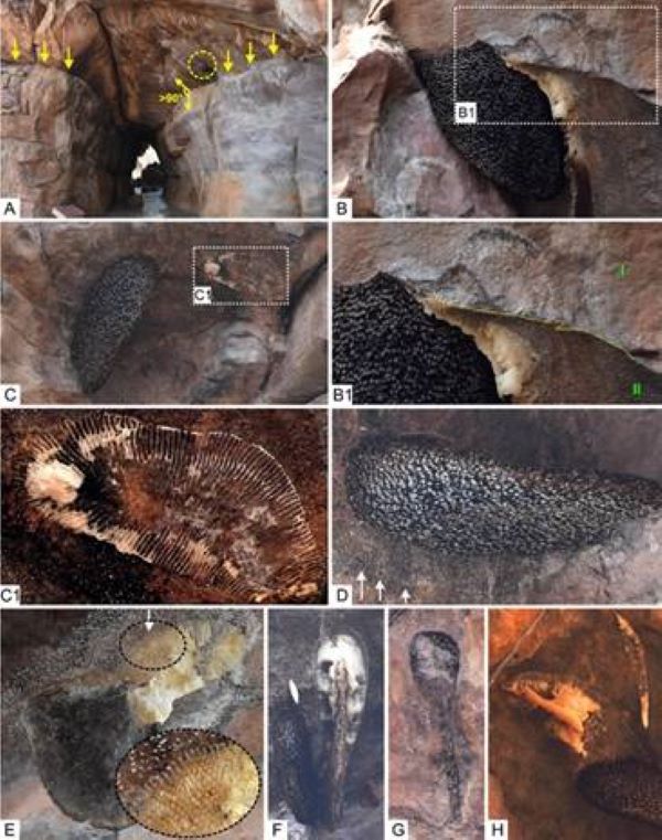 Part of it was preserved on the bedding plane and part of it on transversally cut face of the Maihar Sandstone outcrop. Both fresh and decayed honey beehives were observed on the same bedding plane.