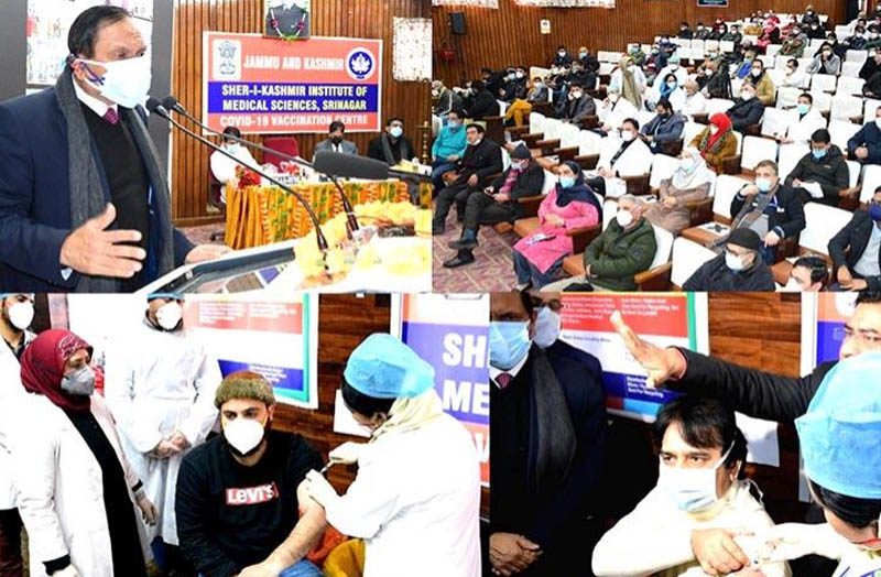 Srinagar: On the occasion of e-launch of massive Covid-19 vaccination drive across the country by Prime Minister, Narendra Modi, Advisor to Lieutenant Governor, Rajeev Rai Bhatnagar today kick started the Covid-19 Vaccination drive in Kashmir at Sher-i-Kashmir Institute of Medical Science (SKIMS), Soura by giving first shot of COVISHIELD vaccine to Director SKIMS Prof A.G Ahanger.