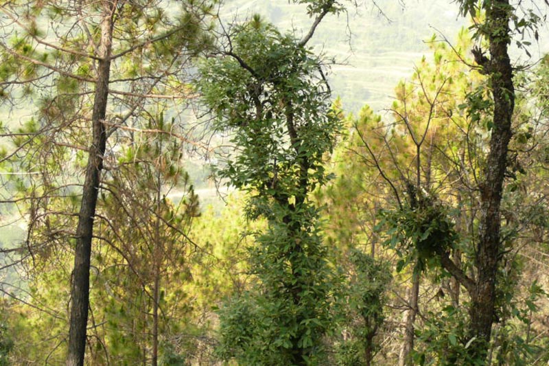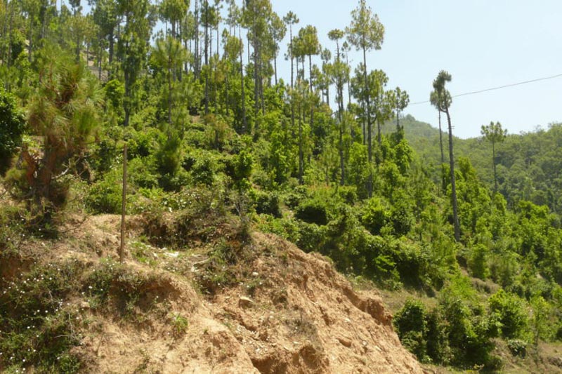 Pine saplings growing in a heavily degraded oak forest area. Pine tends to invade oak forest once the canopy opens up due to lopping or fire events. Photo by Ghazala Shahabuddin.