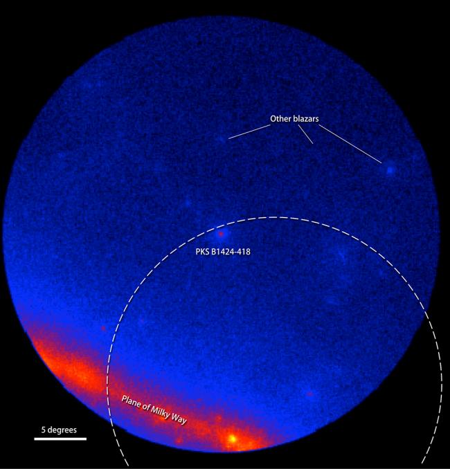 In a paper published Monday, April 18, in Nature Physics, the team suggests the PKS B1424-418 outburst and Big Bird are linked, calculating only a 5-percent probability the two events occurred by chance alone. Using data from Fermi, NASA’s Swift and WISE satellites, the LBA and other facilities, the researchers determined how the energy of the eruption was distributed across the electromagnetic spectrum and showed that it was sufficiently powerful to produce a neutrino at PeV energies.