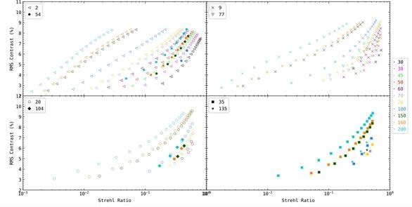 Comparing the results of the idealistic simulations to practical systems, they computed an efficiency factor deriving an efficiency of about 40 to 55% for the Strehl ratio and about 50% as a lower bound for contrast.
