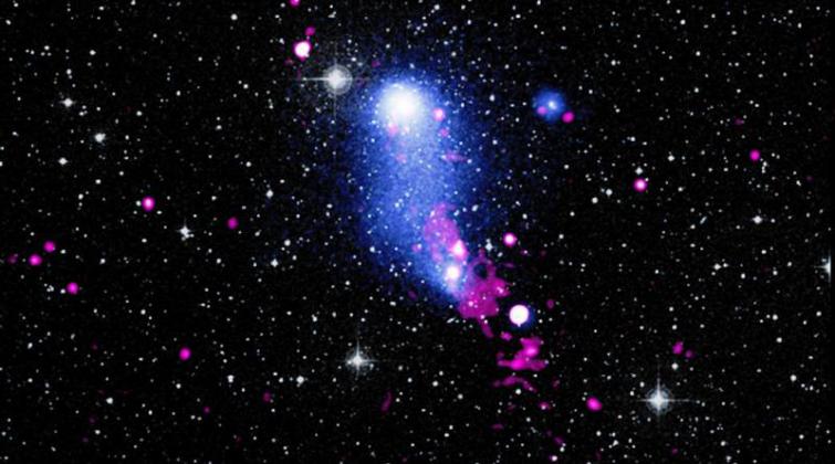 A superheated gas bridge in Abell 2384 is shown in this composite image of X-rays from NASA's Chandra X-ray Observatory and ESA’s XMM-Newton (blue), as well as the Giant Metrewave Radio Telescope in India (red).