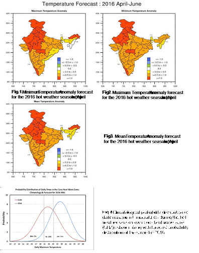 "The season averaged mean temperatures of sub-Himalayan West Bengal & Sikkim, Nagaland, Manipur Mizoram, & Tripura and Assam & Meghalaya are likely to be warmer than normal by<0.5oC and that of the remaining subdivisions are likely to warmer than normal by 0.5 to 1oC. There is also a high probability (76%) of maximum temperatures in the core Heat Wave(HW) zone during the hot weather season of 2016 to be above normal (Fig.4). Core HW zone covers states of Punjab, Himachal Pradesh, Uttarakhand, Delhi, Haryana, Rajasthan, Uttar Pradesh, Gujarat, Madhya Pradesh, Chhattisgarh, Bihar, Jharkhand, West Bengal, Orissa and Telengana and met subdivisions of Marathwada, Vidharbha, Madhya Maharashtra and coastal Andhra Pradesh. This in turn suggests high probability of moderate and severe heat wave conditions in core HW zone during the hot weather season," read the statement.