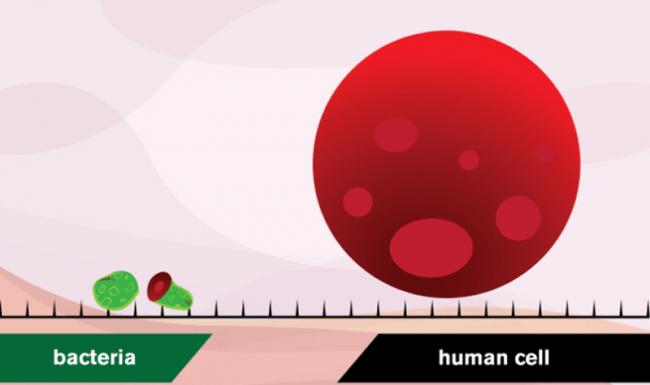 The sharp flakes do not damage human cells. The reason is simple: one bacterium is one micrometer – one thousandth of a millimeter – in diameter, while a human cell is 25 micrometers. So, what constitutes a deadly knife attack for a bacterium, is therefore only a tiny scratch for a human cell.
