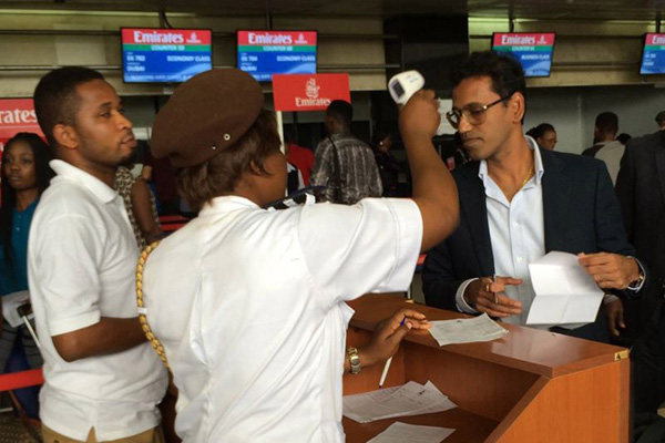 Passengers about to depart from Lagos airport, Nigeria, are being checked for their body temperature to make sure they don't have fever, one symptom of Ebola. Photo: WHO/S. Bolton