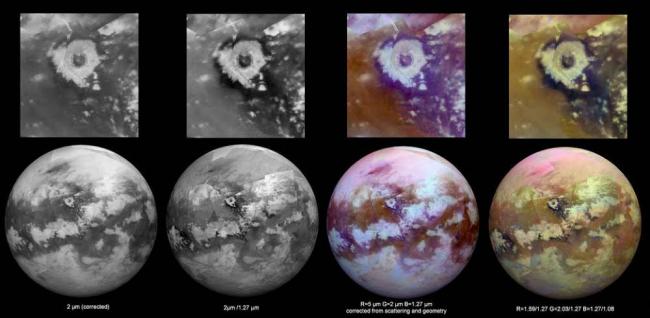 In each montage, the images from left to right present different views that demonstrate the broad spectral capability of the VIMS instrument. The upper row of images in each montage shows a particular region of interest; one features the 50-mile-wide (80-kilometer-wide) Sinlap impact crater, while the other focuses on the region surrounding the landing site for ESA's Huygens probe. The lower row of images features maps of the hemispheres in which these regions are located.