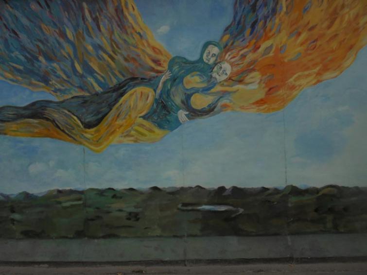 Exiled Iranian artist Kani Alavi has this mural titled It’s Happened in November with heads of many people as if emerging in a flood. Alavi came to Germany in 1980 from trouble-torn Iran. In an interview with DW, the German channel, when asked why artists, including him, painted the Berlin Wall he had said, “... it’s a document and we’re fighting to preserve it so that no one comes up with the idea of building another wall in Berlin.” Talking about the restrictions on Iranians travelling to the US imposed by President Donald Trump (2017), Alavi invited him to visit the East Side Gallery so that “ ...I can tell him why this wall in Berlin is still standing.”