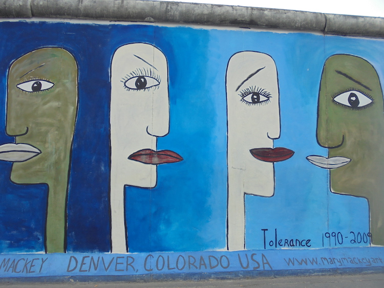 The mural tilted Tolerance by Mary Mackey of USA highlights images of a rainbow population. She was the only American artist to be invited to be a part of the painting project in 1990. Mackey was also one of the artists invited to help restore the murals in 2009 which were depleting through wear and tear.