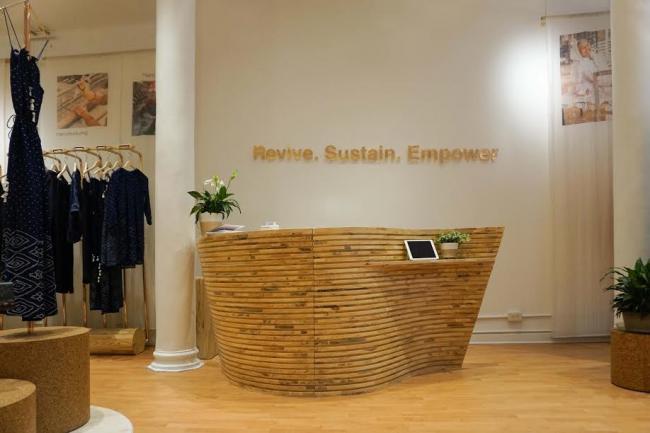The space is bathed in natural light and accented by elements in rose gold, cork and recycled wood. Every detail is special in this store, from custom-made racks that give a nod to the humble shuttle (used to handweave fabric) and dreamy wall panels of handwoven chanderi and khadi that tell the journey of the brand.