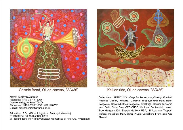 “Kali on ride is an oil on canvas where the five orange circles depict five human indriyas, and Shiva is symbolic. Thus, Kali; the absolute, is controlling the five indriyas responsible for all human activities,”added Majumder.
