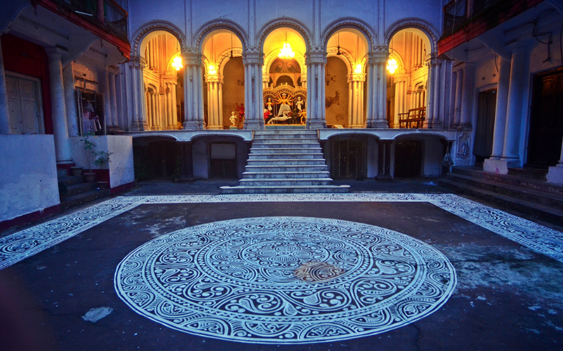 Lensman Avishek Mitra captures glimpses of pre-puja portraits of two north Kolkata family pujas- Girish Park Shymal Dhan Dutta Bari and Girish Park Raj Krishna Mitra Bari. The latter has come up with an elaborate alpona, the Bengali folk art design on the floor consisting of motifs, patterns, and symbols.