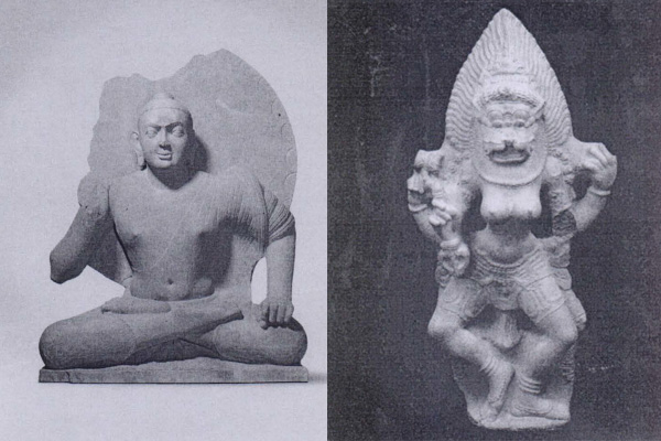 The objects are a stone image of Pratyangira from Tamil Nadu, a marble stele (upright stone slab) from Andhra Pradesh showing devotees of Buddha, and a stone image of the Buddha from the Mathura region.