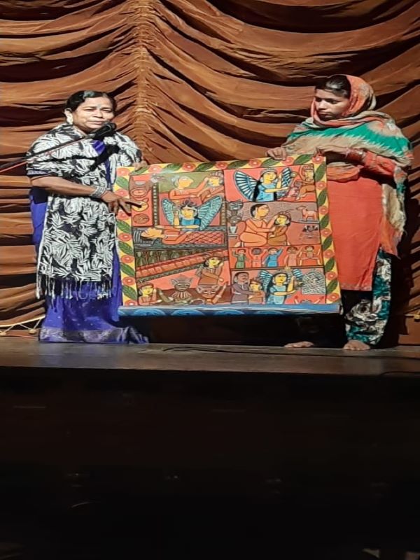 In another performance, well-known Pata Chitra artist Manimala Chitrakar retold the story in the traditional form of the Medinipur region of Bengal in eastern India, using a long scroll with scenes of the story painted as frames, accompanied by a song.