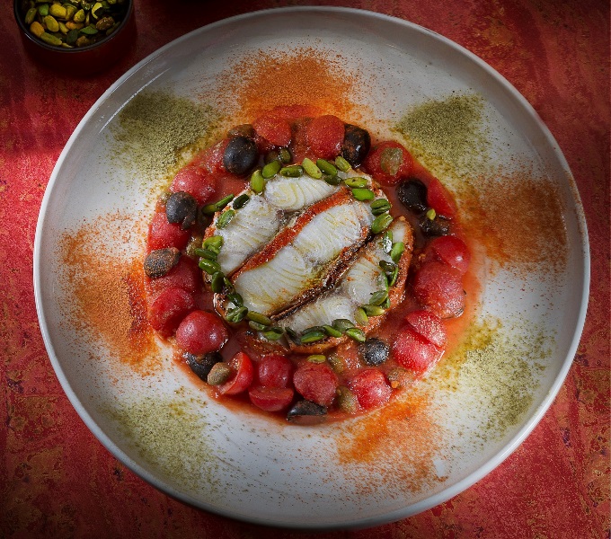Names of Three Non-Veg Dishes - Wine Poached Seafood Terrine, Bell Pepper Chicken Salami, Roasted Butterball Turkey with Oven Roasted Vegetables and Herb Gravy, Sumac and Ginger Poached Fish, Sungur Rah Rai Koh Saag (Slow cooked pork with Mustard greens)