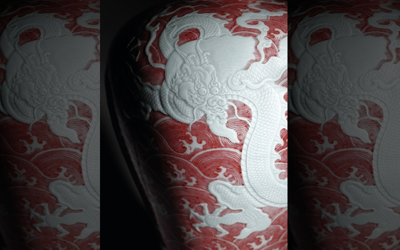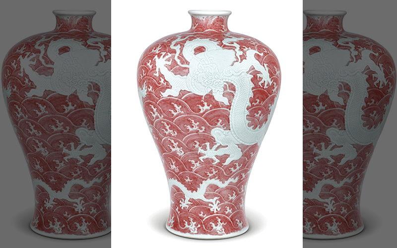 This very rare Yongzheng meiping vase features finely 'pencilled' painting of turbulent waves, exemplifying a masterful command of the brush executed in underglaze-copper-red, whilst the dragon is reserved in white and delicately carved in fine details to portray a lively, powerful, and upright dragon.