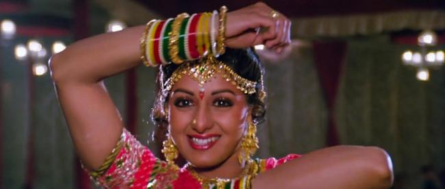 Sreedevi dances to the song number mere haathon mein nau nau chooriyan hai in Chandni (1989) to lyrics by Anand Bakshi and music by the Shiv-Hari duo at a sangeet ceremony for a cousin’s marriage where men are not allowed. Wearing a pink ghaghra-choli-odhni filled with zardozi and decked in heavy jewellery, she places the focus on the colourful bangles in her hand which, unlike the rest of the gold she wears, includes cheaper bangles of plastic, This is purely an ingredient for entertainment with a dance number by Sreedevi put in to raise the box office value of the film. There is a romantic teaser in that the hero (Rishi Kapoor) tries to smuggle himself in by covering his head with a towel and pleads with other women when caught to let him stay just to ogle at the girl he is falling in love with.