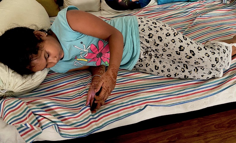 Tuktuk, a nine-year-old girl from an economically weaker section of India, manages her online classes with a basic smartphone that her mother has been gifted by her employer.