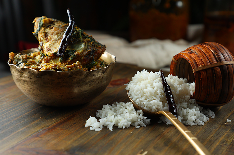 “Mawa Ghat Er Illish Bhorta is typical preparation from Munshiganj, Bangladesh,” informs Chef Bhaskar. But the Chef here has experimented a bit and has blended the Cox Bazar recipe which uses finely diced raw onions to be mixed at the end. For the bhorta, pieces of illish (the tail pieces) were shallow fried in mustard oil, then the flesh were taken out and de-boned thoroughly.