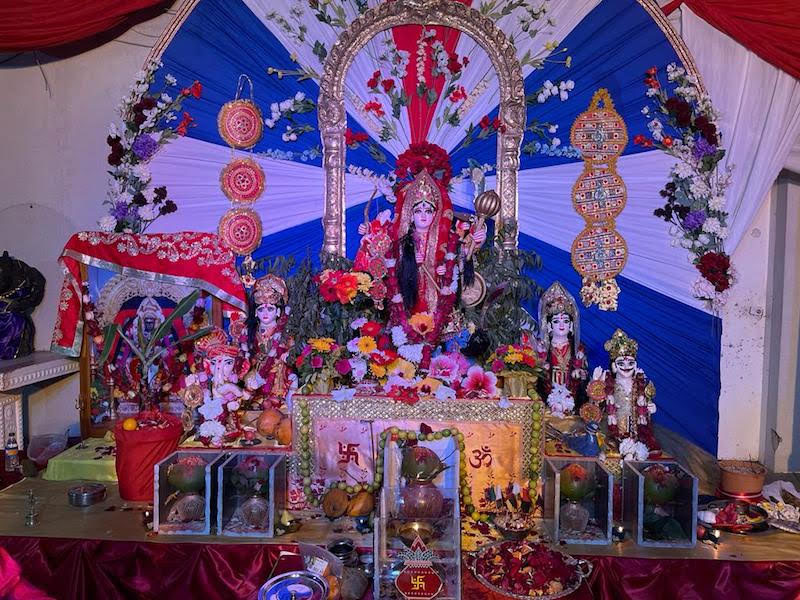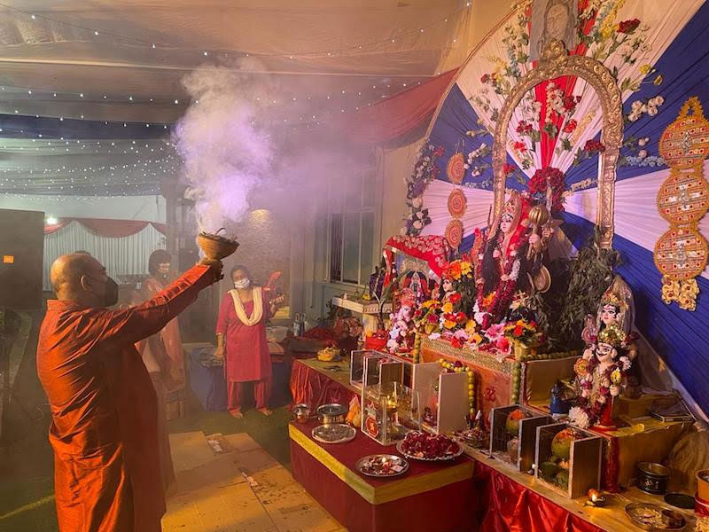 In pre-Covid times some 250 to 500 people would attend the aarti or the puja. Due to restrictions this year they allowed only 50 people. "After aarti we run a live snacks counter. People participate to make snacks which range from golgappa (fuchka), veg pakora, papri chat, bhelpuri, etc. This is followed by Prasad. Menu is different on different days of the puja. The cooking is without onion and garlic."