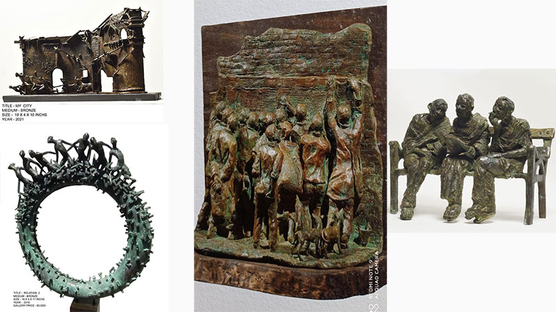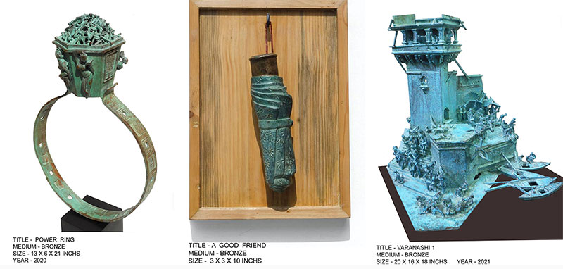 Artist Barun Pramanik said his art is based on spiritual essence as well as aspects of daily life. Partial to working in bronze, some of his displays include crowds along Varanasi Ghats, books, an umbrella, my city, ring and music.