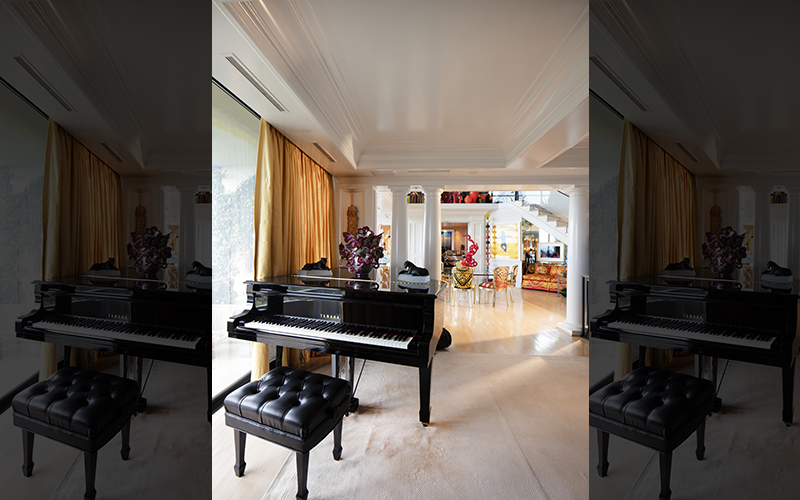 The condo served as a personal sanctuary with a grand piano (estimated $30,000-50,000) , art glass collections, antiques, and artifacts from his global travels.