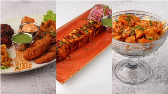Other dishes include Fish & Chips (seasoned and gold-crusted fish fillet, served with seasoned fries and tartar sauce, jungle sauce and kachumber), Spicy Chicken Drumsticks (tangy Cajun-spiced charred chicken drumsticks with chili cilantro sauce), non-veg Kebab Platter (gunpowder chicken tikka, spicy drumstick, fried calamari, Mexican prawns, fish fingers, tartar sauce, and chipotle aioli), etc.