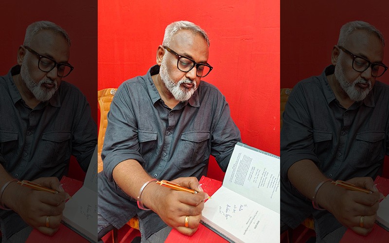 Arindam Basu signs a copy of the book at the Kolkata book fair. Photo courtesy: Official FB