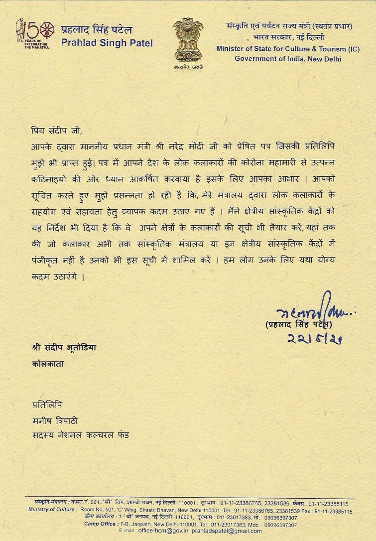 Kolkata/IBNS: Responding to an open letter to Prime Minister Narendra Modi by Kolkata-based cultural and social activist Sundeep Bhutoria, Prahlad Singh Patel, Indian Minister of State for Culture and Tourism (IC), has assured that the government will take suitable measures to support the poor folk artistes and artisans who faced immense hardship in the wake of Covid-19 pandemic.