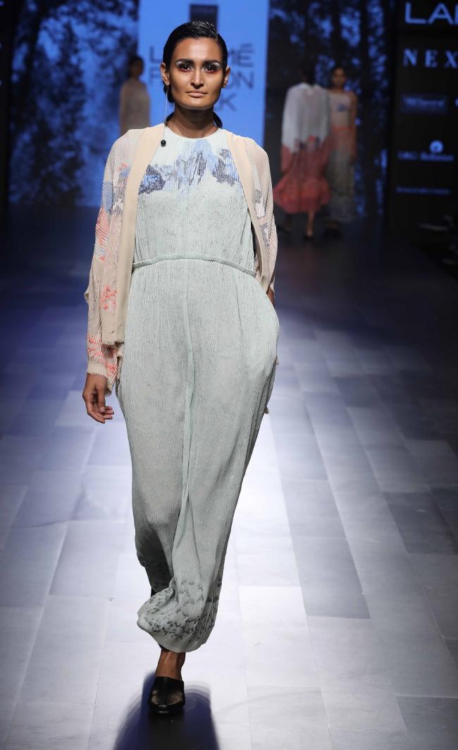 Pastel shades of beige and watery blue had delicate floral prints; while the silhouettes were relaxed and feminine with maxis, wrap slit midis and covers.