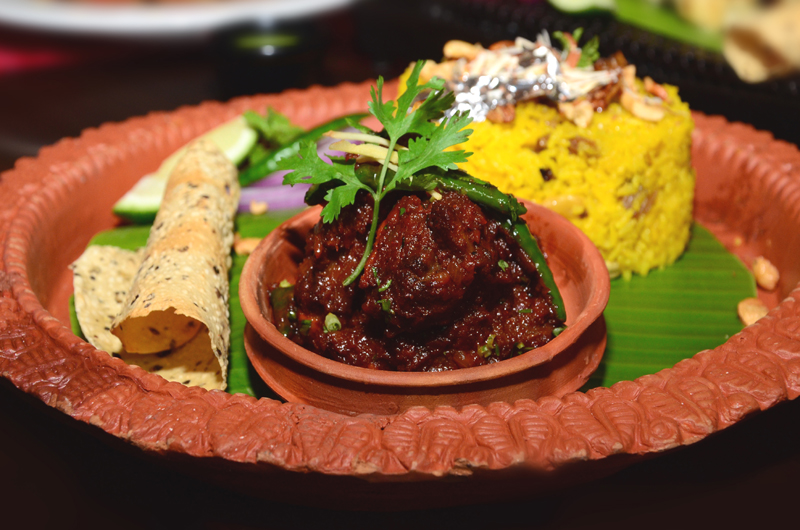 The main course is quintessentially Bengali with Prawn Malai Curry (Golda chingri cooked in a creamy curry flavoured with spices, coconut milk, and served with steamed rice), Bhetki Paturi With Steamed Rice (Kolkata bhetki marinated with ground mustard, green chili, mustard oil, poppy seeds, and wrapped in a banana leaf) and Sorshe Ilish (Hilsa marinated in mustard gravy and served with steamed rice).