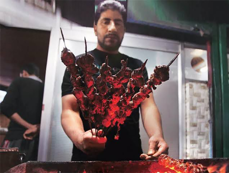 A street at Khayam Chowk in Srinagar city has been popular for decades for its delectable street food, especially Seekh Kebab and Kanti (Mutton Kanti or Tujj is marinated shallow fried mutton pieces- barbequed over blazing red embers- and cooked again in spicy gravy).
