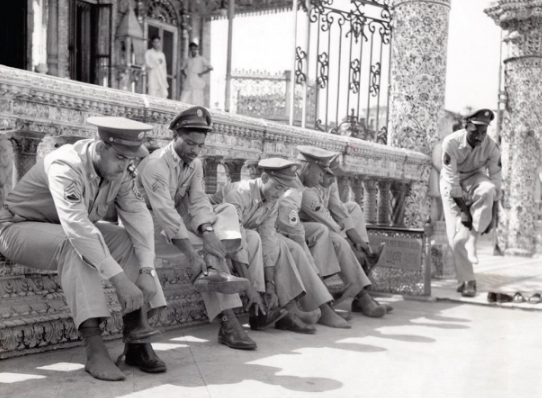 The Second World War, like countries worldwide, also singed India. There is an evocative photo of US soldiers taking off their shoes to enter the famous Jain temple in Kolkata; another shows world champion boxer Henry Armstrong as a soldier giving impromptu lessons to local boys.