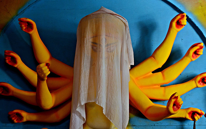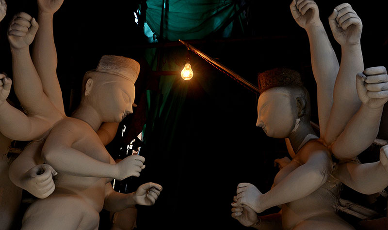 In the warrens of Kolkata's clay artists' colony Kumartuli, the idols of goddess Durga with ten splayed arms and three observant eyes, are getting final touches in the second year of a global pandemic. IBNS writer Debayani Bose marvels at the defiance of the potters to disease and universal budget crunch as they mold the lumps of clay into paragons of divinity