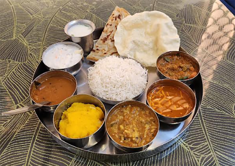 Highlights: A south Indian Thali which includes plain rice with sambar, curd rice, bisi bele bhaat, Malabari paratha, vegetable korma, rasam, kesari halwa, chaach, apallam papad
