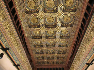 Mudejar art of decoration lays special emphasis on the techo artesonado, or ornately decorated coffered wooden ceiling. The spaces within the beams were covered with wood carvings, using geometric designs and plant motifs, or calligraphy. One of the finest examples, experts say, is this palace in Seville.