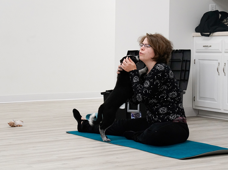 Yoga instructor Sarah Judd teaches her class while a puppy attempts to interrupt on Saturday, Apr. 8, 2023, at Selfie Love in Columbia. The class was a collaboration between Selfie Love, Sarah's Yoga Studio, and Little Rays of Sunshine Animal Rescue. ( Photo by Lucas Owens)