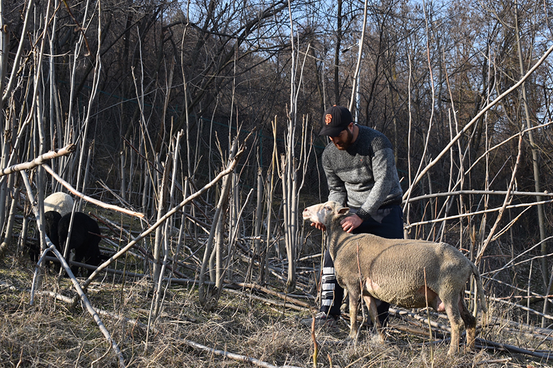 Mohammad Sultan with one of his sheep on Mar. 10, 2022, in Kashmir, India. (Photo by Amir Bin Rafi)
